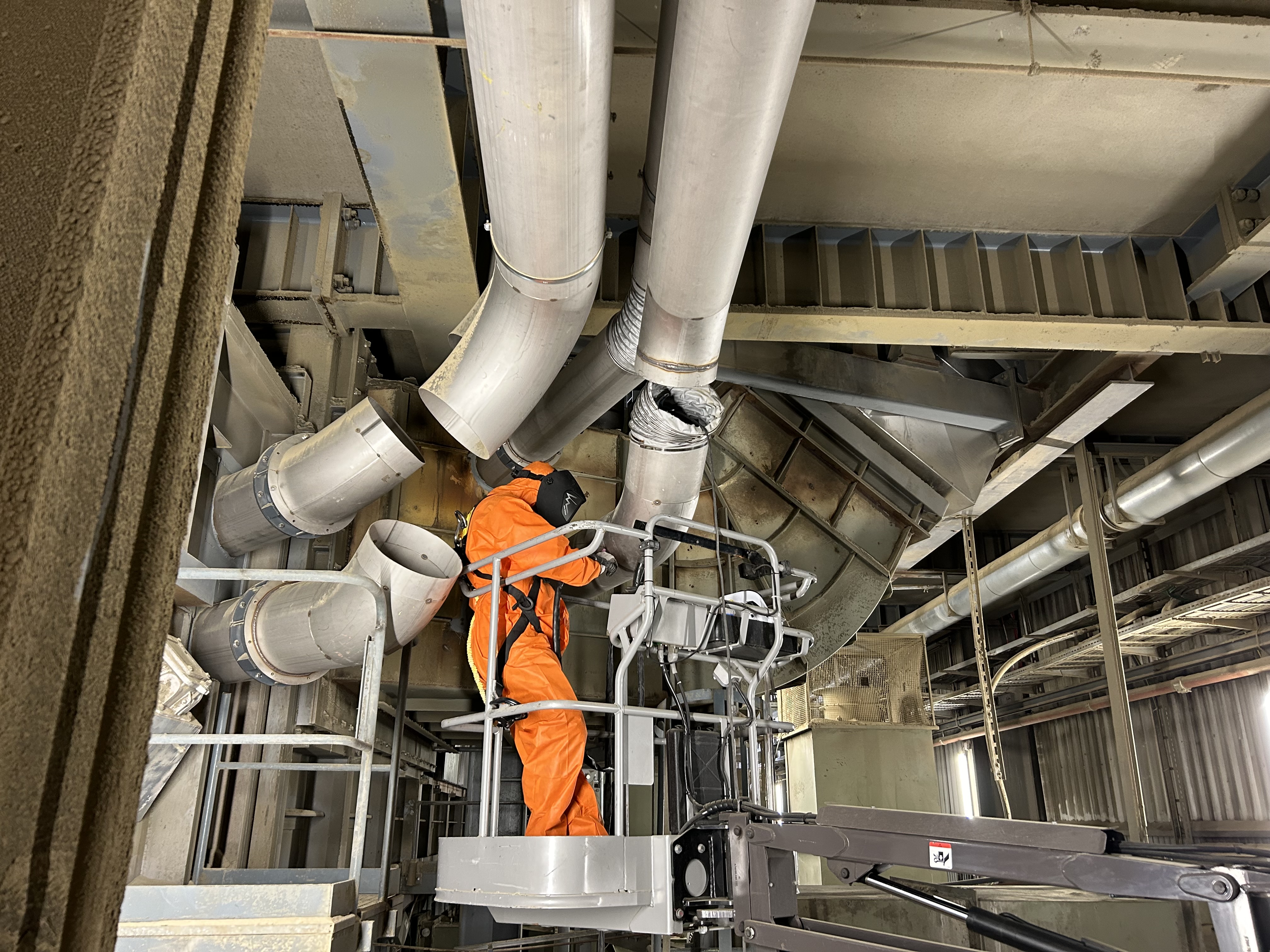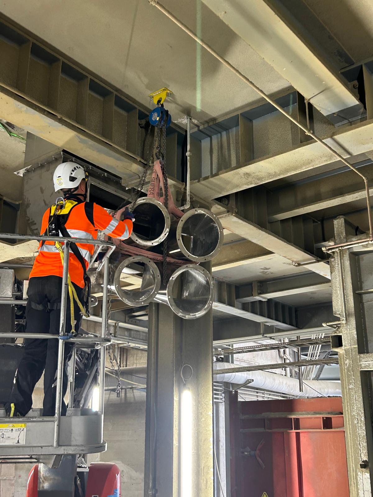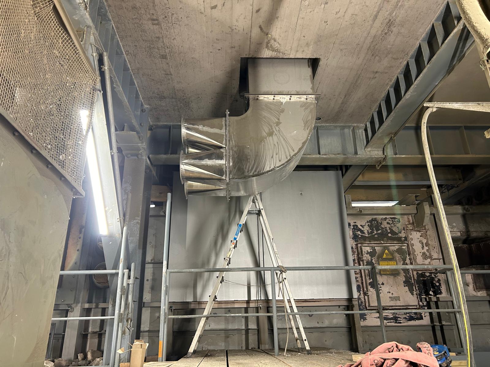 Industrial steel constructionAn existing hot air duct in the cement industry, whose air has a temperature of approx. 700° C, is to be cooled with secondary air (air volume of 60,000m³/h).The cooling system can be installed on site at the customer’s premises, in confined spaces and with minimal structural modifications.